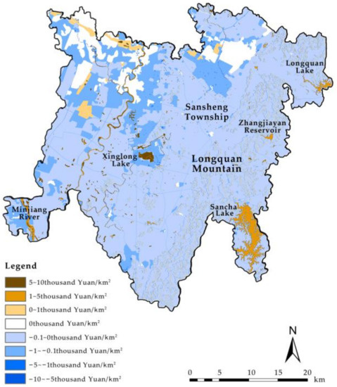 Tianfu New Area strictly implemented the ecological environment protection policy, strengthened the construction of water body and grasslands, and increased their land use areas in the process of orderly construction. In the 10 years, the urban ecological environment had been greatly improved, and the total ESV of the city had increased by 8.2%. This is consistent with the research results of other regions with similar research duration and geographical conditions in China. For example, Li et al. found that during 2008–2018, the ESV in the green heart area of Changsha–Zhuzhou–Xiangtan city group increased by CNY 0.88 billion, with an increase of 11.21% [46], and the growth trend is obvious. Li et al. believed that this was due to the orderly progress of urban construction and protection, and the urban construction mode combining rational development and strict control of the ecological bottom line could improve ESV. The reasons for the impact of land use changes on urban ESV in Tianfu New Area can be summarized as follows: