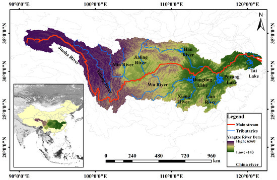 The YRB, located between 90°33′~122°25′ east, and 24°30′~35°45′ north (Figure 1), is the third most extended river basin in the world (about 6397 km) and the third most significant basin in the world (1.8 million km2). Originating on the southwest side of Mount Tangulah in the Qinghai–Tibet Plateau, it spans three major economic zones in southwest, central, and eastern China. It flows west to east into the East China Sea [26]. The Yangtze River Basin boasts a temperate climate, ample precipitation, intricate topography, diverse land-use patterns, and extensive biological resources. Notably, the region harbors a significant proportion of China’s rare and endangered flora, accounting for 39.7% of the national total, and serves as a focal point for the conservation of endangered wildlife.