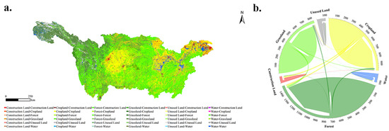 Spatial distribution map of landscape patterns from 2000 to 2020: (a) LUCC transfer chart; (b) LUCC transfer chord diagram.