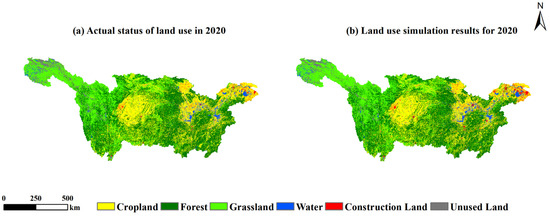 This study takes the land-use data of 2000 and 2010 as the initial data, uses the Markov chain prediction result of 2020 to simulate the land use situation of the YRB in 2020, and selects the above 16 driving factors combined with the actual situation of the Yangtze River Basin. LUCC development potential was represented in the suitability atlas generated by the LEAS module. Land-use demand, transfer matrix, and domain weight parameters were input into the CARS module. Simulation results were verified by the confusion matrix (Figure 4), which showed that the kappa coefficient was 0.901 and the overall accuracy was 93.7%; however, the simulation accuracy of unused land was relatively low, at 83.61%. The accuracy of the other five LUCC types was above 90% (Table 4). Meanwhile, the FoM (Figure of Merit) was 0.41. Therefore, the PLUS model achieved ideal simulation accuracy, accurately reflecting the needs of land-use change in the YRB. It can be used for subsequent simulation predictions.