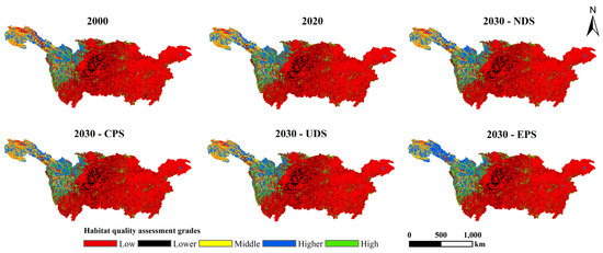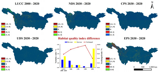 Coupling the In-VEST model with the future LUCC scenario results from PLUS simulations can facilitate the analysis of spatiotemporal changes in HQ of YRB. The changes in HQ of YRB are obtained by superimposing analyses (Figure 7). The spatial pattern of HQ in different LUCC scenarios is relatively stable in 2030. The average HQ of NPS, CPS, UDS, and EPS is 0.212, 0.215, 0.214 and 0.231, respectively, slightly higher than in 2020, but generally lower. Among them, EPS has the most significant improvement in HQ, with an 18.36% increase in the high-HQ area compared to 2020 and a 20.16% increase in the higher-HQ area. NPS, CPS, and UDS, however, led to a 5.41%, 1.23%, and 0.03% decline in the quality of high-HQ areas, respectively. CPS increased the mass lower-HQ area by 2.64%, resulting in a reduction in the area of the other grades. By calculating the difference in HQ change for 2020–2030 (Figure 6), we discovered that regions with unaltered habitat quality index values had a clear advantage, averaging 97.27%. There was some variability between (0.1) and (1.98%). EPS has the smallest percentage of unchanged HQ (93.98%) compared to 2020, and the UDS was the most significant (99.69%). Of the variability (0.1), the EPS area experienced the most significant change, increasing from 1.67% in the preceding period to 3.16%. Meanwhile, the USD decreased significantly, from 1.67% in the preceding period to 0.28%. Based on the overall change trend, EPS had the maximum increase in HQ area (5.13%), while UDS had the minimum (0.04%). NDS had the most extensive decrease in HQ area (1.48%), while UDS had the smallest decrease (0.28%).