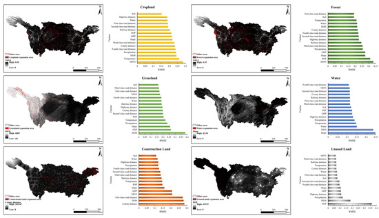 Apart from the macroscopic effects on national policies, micro-natural factors and human activities have also contributed to alterations in landscape patterns [51]. In this study, the PLUS-Land Expansion Analysis Strategy (LEAS) module was utilized to rank the driving factors of various types of land-use changes over the past 20 years based on the selected 16 factors. A contribution analysis of land-expansion factors was also conducted. This approach can provide a better understanding of the selection of and changes in land-use types, and provide a scientific basis for land management and planning. A thorough examination of the 16 selected driving forces reveals that NDVI, temperature, population density, GDP, DEM, and road distance are the primary factors that influence the six types of LUCC in the landscape pattern (Figure 8). NDVI and temperature are the most affected by changes in cropland. This is attributed to the rise in temperatures, which leads to an increase in the demand for moisture and transpiration in the atmosphere. The main driving factors for forest area are NDVI and population density. The influence of temperature on the growth of forest land is reflected in the enhancement of vegetation photosynthesis and the promotion of organic matter decomposition. Grassland is most affected by DEM, the YRB flows from west to east through mountains, plateaus, basins (tributaries), hills, and plains, the Qinghai–Tibet Plateau averages an elevation above 4000 m, grassland covers lower areas, the middle and lower Yangtze River plains are low, most of the elevation is less than 50 m, and the grassland is widely distributed. The water area was the most affected by slope and DEM, and the other influencing factors were more balanced, consistent with the actual situation in the study area. The impact of the growth in construction land is mainly determined by the distance from county residences and the distance from the first road, which indicates that the urbanization process continues to advance and ultimately the residential land area continues to expand. Unused land is strongly affected by population density. The change in population quantity and structure promotes the exploitation of unused land. There is rapid growth in construction land, and human beings obviously improve the development and utilization degree of land development, and the utilization degree of land is obviously improved enhanced by human beings. The expansion of construction land poses a significant threat to the ecological environment of the YRB.