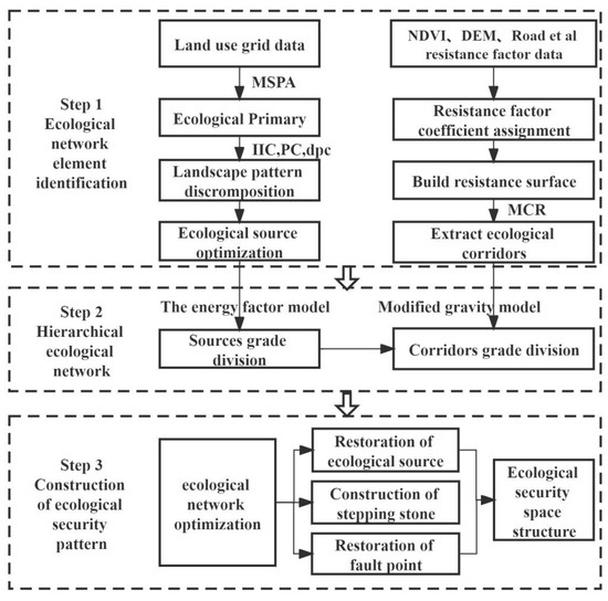 This study is divided into three main steps: (1) identify ecological network elements, (2) construct a hierarchical ecological network, and (3) construct an ecological security pattern. To identify ecological network elements, the land use grid data is selected by MSPA, and then the landscape connectivity is evaluated according to the connectivity index to select the ecological source. Next, the multi-factor ecological resistance surface is constructed, and the potential ecological corridor is extracted using the minimum cumulative resistance (MCR) model. To construct a hierarchical ecological network, the energy factor model and the modified gravity model are introduced to divide the source and corridor levels, respectively. To construct an ecological security pattern, the ecological network is optimized by constructing stepping stones and restoring ecological sources and fracture points. Finally, the ecological security spatial structure is proposed.