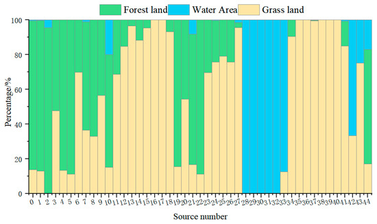 Using Conefor 2.6 software [67], a distance threshold of 5000 m was set on the basis of multiple simulations, and the core area dPC and IIC were calculated according to a connection probability of 0.5. The maximum value of dPC was 46.01, and the minimum value was 0.01. The cumulative contribution rate of the core patch importance (dPC) index was analyzed. The core patch with a cumulative contribution rate greater than 80%, that is, a dPC value greater than 0.3, was selected as the ecological source, some small fragmented patches were removed to eliminate the impact of fragmented patches on ecological network construction, and the ecological red line was superimposed. Finally, 45 patches with dPC > 0.3 were selected as ecological sources. In consideration of actual conditions, some fragmented patches were removed to eliminate their influence on ecological network construction. Finally, 45 patches with dPC > 0.3 were selected as source areas, with a total area of 1.00 × 106 hm2, accounting for 15.06% of the total area of Ningxia. Grassland and forest land were the main land types in the source areas, followed by water areas. Grassland covered an area of 52.33 × 104 hm2, accounting for 50.67% of the total source area, while the proportions of forest land and water bodies were relatively small, totaling 26.87% of the total source area (Figure 3).