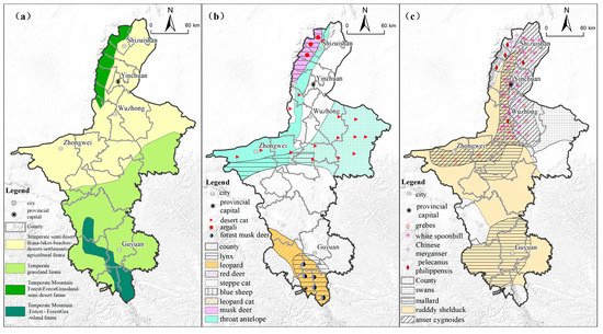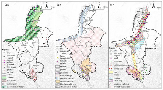 The biodiversity distribution map of Ningxia Hui Autonomous Region: (a) zoo geographical division; (b) beasts; (c) birds (1); (d) birds (2); (e) birds (3); (f) fish.