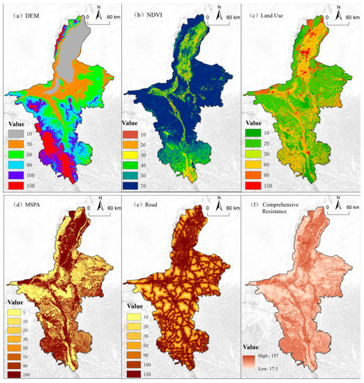 The topography of Ningxia is mainly divided into mountains, plains, hills, and plateaus, with high elevations in the south and low in the north. Increasing slopes can affect surface runoff and greatly increase the possibility of soil erosion, causing changes in ecological suitability and ecosystem stability and increasing landscape resistance against species dispersal and energy flow. Though road construction contributes to socio-economic growth, it alters the distribution of natural landscapes, resulting in severe negative effects on natural landscapes and ecosystems. The normalized difference vegetation index (NDVI) reflects the degree of vegetation coverage, and MSPA landscape types with less human disturbance are closer to source characteristics. The result is less resistance to the movement and dispersal of species. Therefore, elevation, land use type, MSPA landscape pattern, road Euclidean distance, and NDVI were selected as resistance factors, and weight values were assigned on the basis of relevant studies [14,60]. The results are shown in Table 1.