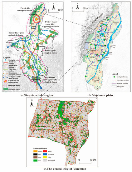 - The ecological security structure of Ningxia is proposed to be a one-belt, three-screen, three-corridor, five-cluster structure based on the network driving surface. The belt is an ecological zone of rivers, lakes, and wetlands, mainly along the main axis of the Yellow River. The three screens refer to the ecological barriers of the Helan, Luo, and Liupan Mountains. The three corridors are the Qingshui River water system corridor, the large Liupan corridor, and the southwest–northeast ecological corridor in the central arid zone. The five clusters, which are desert–forest–grass–lake type, desert–lake–grass type, Daliupan forest–grass–lake type, forest–lake type, and forest–grass type, reflect the characteristics of biodiversity in the east, west, south, north, and central regions of Ningxia around the key source areas, respectively.