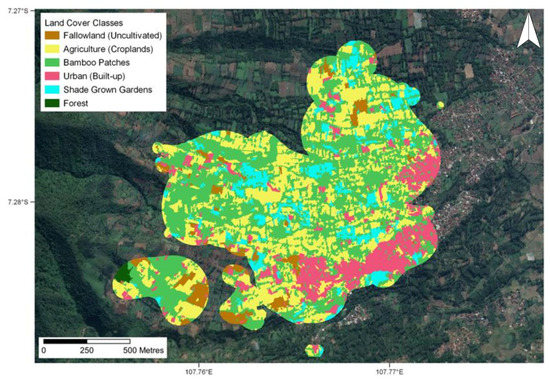 The land cover classification used for cross-analysis to understand the land cover types with which the lorises are interacting was created as a supervised classification in April 2019 (Figure 2). We performed the classification on a high-resolution geo-rectified Enhanced Compression Wavelet file that contained only red, green, and blue (RGB) channels due to the limited availability of high-resolution satellite data in this region for the chosen time period. The original resolution of the raster, taken by the GeoEye-1 satellite and imported from the QuickMapServices tool in QGIS, was 50 cm, and we further resampled the selected image to 1 m resolution for simplification and faster processing. The workflow of the classification started with segmentation via the Orfeo ToolBox in QGIS. This segmentation generated areas of unsupervised polygons of each RGB channel based on pixel values, including not only their radiometric value but also the position and texture of the pixels. Following this, training data were determined in the form of polygons based on both local ground knowledge and visual image interpretation. We calculated the supervised classification using the Random Forest Algorithm due to it being considered a better performer at local scales. The number of trees used in the algorithm was set to 100, and six land cover classes were generated. The land cover classes included Agriculture (Croplands), Bamboo patches, Urban (Built-up), Fallow land (Uncultivated), Forest, and Shade grown gardens.