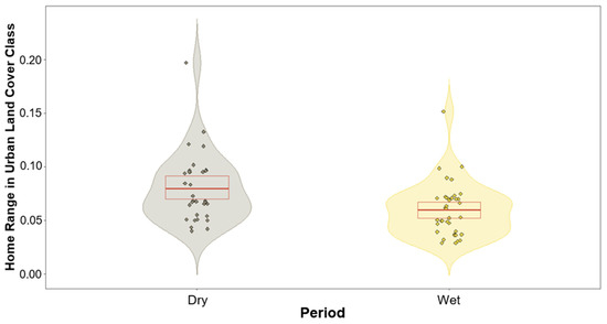 Violin plot showing response variables based on the prediction of the model of urban land cover class within home range for both dry and wet periods. Dry period (left violin) depicting greater usage overall compared to wet period (right violin). Red box depicts the first and third quartiles, central red line the median.