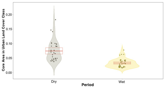 Violin plot showing response variables based on the prediction of the model of urban land cover class within core areas for both dry and wet periods. Dry period (left violin) depicting much greater usage overall compared to wet period (right violin). Red box depicts the first and third quartiles, central red line the median.