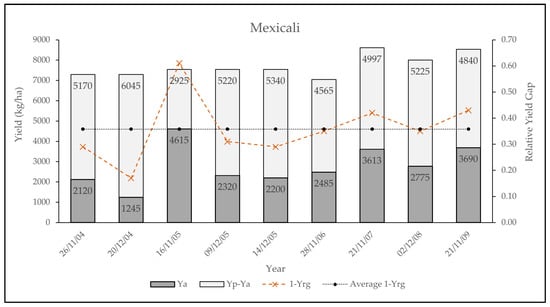 Actual yield (Ya) (kg/ha), yield gap (Yp-Ya) (kg/ha), relative yield gap (1-Yrg), and average relative yield gap for Mexicali. Planting dates of the reported years are also shown on the horizontal axis.