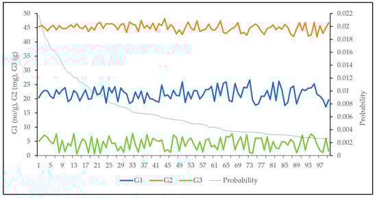 Mexicali’s 100 most probable combinations of genetic parameters of G1 (no/g), G2 (mg), and G3 (g) and their corresponding probabilities.