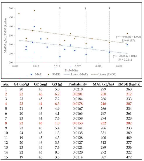 Notably, G1 and G2 exhibit lower variability, particularly at higher levels of probability, making them the most probable combinations. Figure 4 shows MAE and RMSE estimated between actual and simulated yield with the 15 sets of genetic parameters scoring the higher probabilities computed with GLUE. Regression analysis between MAE, RMSE, and probability showed that despite errors (i.e., MAE and RMSE) decreasing with increasing probability, (a) the slopes of the regression lines were not statistically significant at p = 0.05 (p-values of 0.07 for MAE and 0.10 for RMSE were found) and (b) weak association (as indicated by the low R2 values—0.22 and 0.20 for MAE and RMSE, respectively) between MAE and RMSE and probability was found. Such findings agree with these from James et al. (2013) [], who also noted that changes in statistical measures, such as these used in this study, are likely not strongly associated with changes in probability. Besides the fact that the first combination is not necessarily the optimal one for the model, the accompanying Figure 4 table indicates that different sets of genetic parameters produce comparable values for statistical measures. Thus, the selection of the most appropriate genetic parameters can be determined by evaluating the statistical measures that are deemed most relevant for the intended application. These conclusions agree with a multi-model calibration study [], which explored the advantages and disadvantages of several calibration methodologies but was unable to identify the most appropriate calibration procedures. They concluded that relying only on automatic calibration techniques may not be the best approach, although manual trial and error tends to produce non-optimal and non-replicable solutions.