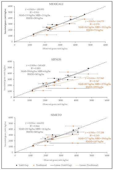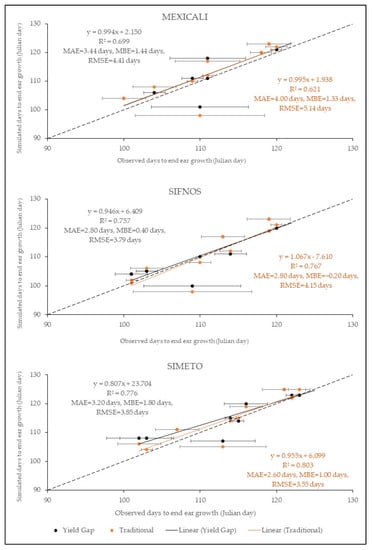 Although high correlation (R2 > 0.60) for anthesis dates was found from the comparison of all cultivars and calibration strategies, yield gap analysis produced a higher value for Mexicali, explaining about 8% more of the measured variability observed in the field (R2 was 0.699 vs. 0.621) and slightly worse values for Sifnos (R2 was 0.757 vs. 0.767, respectively) and Simeto (R2 was 0.776 vs. 0.803, respectively) (Figure 5). In contrast to MBE, lower MAE and RMSE were found by the YgC for Mexicali and Sifnos, regarding the former statistic, and Simeto, regarding for the latter. The yield gap analysis reproduced better (lower) statistical measures for this development stage for Sifnos than Mexicali and Simeto and the TrC for Simeto. The slopes and intercepts of the regression lines were in favor (closer to unity and zero, respectively) of the TrC for Mexicali and Simeto and of the YgC for Sifnos. The differences in statistical measures and regression characteristics between the two strategies is attributed to the different modes in which the crop model was run (potential mode for YgC vs. rainfed mode for TrC) and not to the yield gap analysis, which intends to improve yield predictions only.