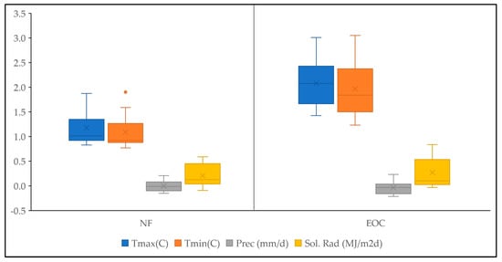 Differences in maximum (Tmax) and minimum (Tmin) air temperature, daily solar radiation (Sol. Rad.), and precipitation (Prec.) during the growing season (1 December–30 June) from the EURO-CORDEX ensemble between the near-future (2021–2050) (NF-left part) and the end-of-the-century (2071–2100) (EOC-right part) and the reference period (1981–2005) (REF) for Thermi (northern Greece) for the emission scenario RCP4.5.