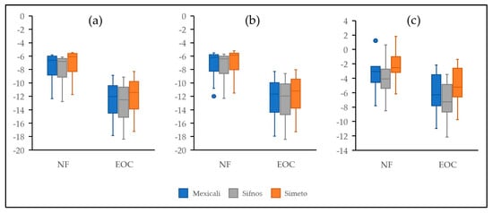 When the historical time series from the site’s meteorological station (covering the period 1979–2010) were independently adjusted (positive or negative) by the differences (11 such sensitivity experiments were conducted—one for each climate model) expected in NF and EOC (the genetic parameters produced with the YgC_adj strategy were used), crop simulated anthesis and maturity are anticipated to occur earlier, primarily due to increasing temperatures in Figure 7. Anthesis is showing a decrease by 8 days for the NF period and 13 days for EOC for Mexicali and Sifnos, and by 7 days for NF period and 12 days for EOC for Simeto (Figure 8a). As for maturity, decreases by 7 days for the NF period and 13 days for EOC for Mexicali, by 8 days for the NF period and 13 days for EOC for Sifnos, and by 8 days for NF period and 12 days for EOC for Simeto are projected (Figure 8b). On the other hand, the mean and median values of potential grain yield are expected to show a similar decrease for the three cultivars for each period, varying from 2.2 to 3.9% for the NF period, and from 5.0 to 7.1% for the EOC period (Figure 8c)