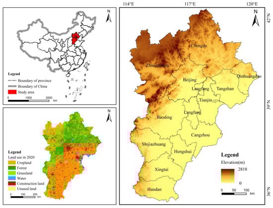 The economic and political center of northern China is located in the BTH []. The rapid economic development of the BTH and the increasing urbanization rate has aggravated ecological and environmental problems []. Higher standards for the simultaneous development of high-quality socioeconomic and ecological civilization have been implemented in response to the BTH’s coordinated development.