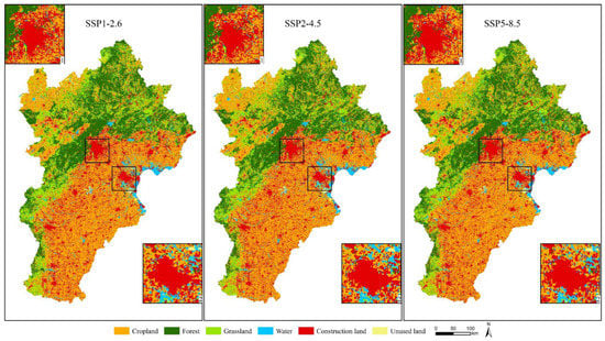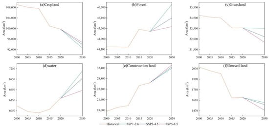 According to the results (Figure 3 and Figure 4), which were simulated by the PLUS model, in 2030, cropland, forest, grassland, and construction land will become the significant types of land use in the BTH (the four account for more than 96%). In general, the decline in grassland and cropland, along with the increment of construction land and forest to varying degrees, will be the common characteristics of the three SSP–RCP scenarios. This is in accordance with Fan’s research results []. Specifically, the quantity of diverse lands varies considerably under the three scenarios. SSP1-2.6 has the fastest growth rate of forest area and decreasing rate of cropland; grassland surfaces exhibit a slightly decreasing trend relative to 2020, while the construction land area of the SSP1-2.6 scenario has a minor proportion relative to the other two scenarios. The change trends of various land use in SSP2-4.5 are similar to those of SSP1-2.6 but differ in terms of their change ranges. The expansion rate of construction land in SSP5-8.5 is the fastest, which is 1.2 times that of SSP1-2.6 in comparison to other scenarios. However, its cropland area accounts for the greatest percentage of each of the three SSP–RCP scenarios.
