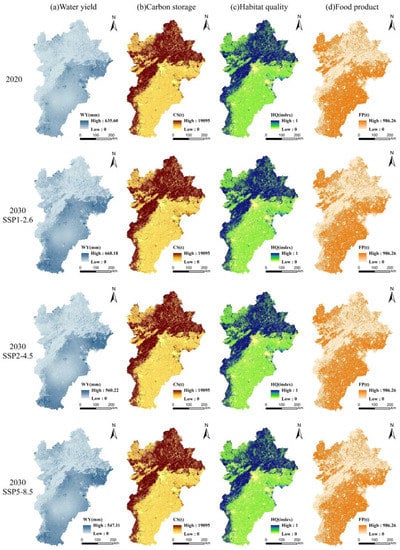 By coupling the PLUS–InVEST model, this paper effectively simulated the ESs supply capacity of three SSP–RCP scenarios in 2030. Ecological risks in various regions were cataloged, and zoning was established accordingly. The results are as follows.