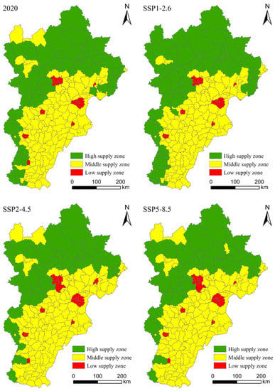 MESLI was utilized to assess the comprehensive supply capacity of ESs in different counties with the county-level administrative districts of the BTH as the unit. To more clearly identify how ESs vary in various areas, the Jenks Natural Breaks in ArcGIS was employed to categorize the MESLI of the BTH in 2020 and under the SSP–RCP scenarios in 2030 into high supply zones (1.47–1.88), middle supply zones (0.96–1.47), and low supply zones (0.19–0.96) (Table 4; Figure 6). There is apparent spatial heterogeneity in the MESLI of the BTH in terms of distribution. Zones with high supply are mainly located in the Yanshan–Taihang Mountain area, the hilly area, and the Piedmont Plain in the eastern section of the Yanshan Mountains. The Yanshan–Taihang Mountain area is dominated by forest and grassland, with high vegetation coverage and biodiversity and a strong capacity for carbon storage. The hilly area and the Piedmont plain in the eastern section of the Yanshan Mountains are mainly cropland with relatively high precipitation. Therefore, the strong food product capacity and service capacity of water yield led to a high supply capacity of regional ESs. The middle-supply zones are mainly distributed in the Bashang Plateau and the Hebei Plain, which mainly includes cropland ecosystems with a strong capacity for food production. However, this area is highly impacted by human activities and has moderate carbon storage capacity. The low-supply zones are primarily located in regions with a higher proportion of urban construction land. The service capacity of water yield is strong, but the supply capacity of other ESs is low in this area. In terms of the area proportion, the area ratio of middle- and high-supply zones is relatively high, while that of low-supply zones is relatively low. The proportion of high-supply zones to the total area is the highest (56.35%) among the three scenarios under the SSP1-2.6 scenario. The areas occupied by the low and the middle supply zones are the largest among the three scenarios under the SSP2-4.5 scenario, which are 6023.87 km2 and 107,813.96 km2, respectively. However, the middle supply zones accounted for a larger proportion under the SSP5-8.5 scenario (50.19%).