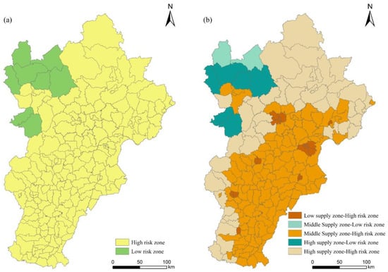 Given these results, we built a two-dimensional correlation judgment matrix that incorporates the ES supply capacity and ecological risk (Figure 8b). The superposition results of ES supply ecological risk were obtained. Regions with high supply–high-risk characteristics are dispersed throughout the Yanshan–Taihang Mountains. They cover an area of 92,789.52 km2, which is approximately 43.42% of the research area. Regions with high supply–low-risk characteristics are clustered principally in the northwest and south regions of the intermountain basin in northwest Hebei. The area of these regions is 19,335.07 km2, which accounts for 9.05% of the area. Zones with middle supply–high characteristics risk are mostly located in the agricultural production regions of the Hebei Plain and the center urban area of Zhangjiakou. The area is 90,542.48 km2, which accounts for 42.36% of the research area. Regions with middle supply–low-risk characteristics are concentrated in the Bashang plateau area. They occupy an area of 6775.72 km2, of which percentage reached is 3.17% of the BTH. The zones of low supply–high-risk characteristics are distributed in the central urban area of the Hebei Plain with a spotty pattern. They cover an area of 4274.90 km2, which is about 2.00% of the research area.
