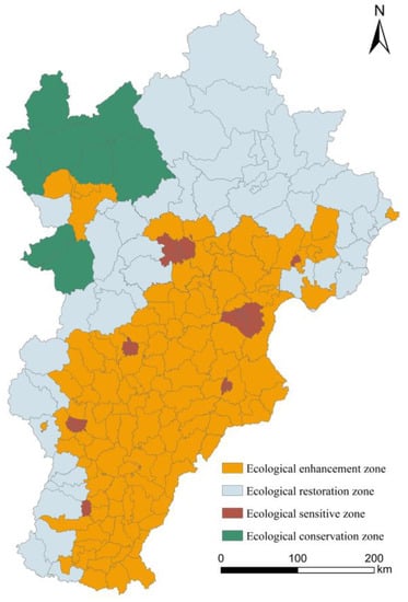According to the spatial type of the supply capacity–ecological risk characteristics of ESs, and the characteristics of different regions, we divided the BTH into four ecological zones. These zones (Table 5; Figure 9) consist of the ecological enhancement zone, ecological restoration zone, ecological sensitive zone, and ecological conservation zone.