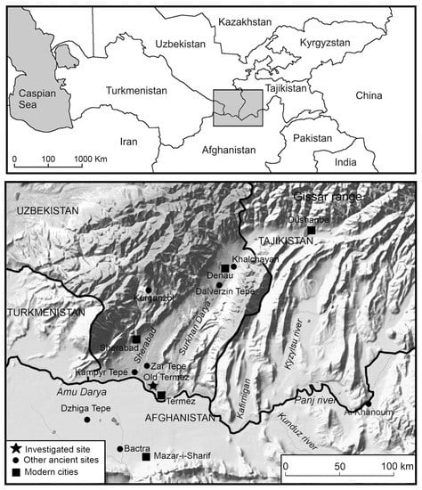 - Pidaev, S. Contribution à l’histoire ancienne de Termez. In La Bactriane au Carrefour des Routes et des Civilisations de l’Asie Centrale; Leriche, P., Pidaev, S., Gelin, M.K., Abdullaev, J., Eds.; with the Collaboration of Fourniau, V.; Maisonneuve and Larose: Paris, France, 2001; pp. 47–57. [Google Scholar]