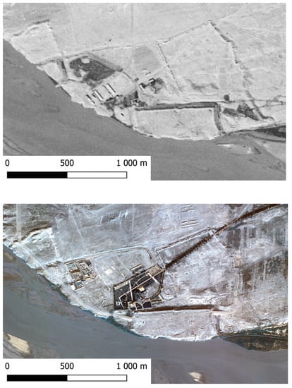 Wind and fluvial erosion are the two agents that have most affected the site’s architectural structures and archaeological strata. Fluvial erosion has particularly damaged the Citadel and Tchingiz Tepe enclosures in the westernmost part of the urban site. The first plans of the site in 1936 show that most of the southern part of the Citadel was missing at that time, although its rectangular shape was still recognisable [10] (pp. 126–130). Since then, a large part of the Citadel has disappeared because of erosion. The comparison of the CORONA satellite images (DZB00403800056H011001, 20 October 1964) and modern pictures on Google Earth is indicative of the impact of fluvial erosion in this part of the site in the last fifty years [11] (Figure 2). Wind and rain have also contributed to the loss of archaeological structures in ancient Termez. The impact of those agents can be observed by comparing the state of buildings and walls in images taken by Masson’s archaeological expedition in 1936 [12] with their present appearance. Aeolian deposits are found in several areas of the site, especially in Tchingiz Tepe [13]. A geoarchaeological survey in Tchingiz Tepe showed that the surface deposits, which are over two metres thick in some places (2 to 2.8 m), have formed in the last 2000 years through the action of two natural agents, gravity and wind, and an anthropic process (construction, abandonment, and rebuilding of dwellings) [7].