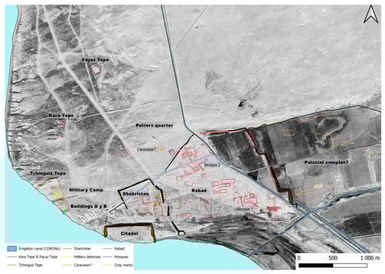 A caravanserai dated to the 12th century was documented in the Rabad [24] and excavated in 1986. This construction is no longer visible on the surface and does not appear in CORONA images. In contrast, the WV3 image exhibits some traces in the ground surface that may correspond to the ruins of this building. They are located north of the Rabad, outside the enclosure, near the north access. The palace to the east of the Rabad, excavated by the TAKE expedition in 1936 and 1937 [12], does not appear in the satellite images, although the area has been significantly altered since that time by irrigation channels for farming.