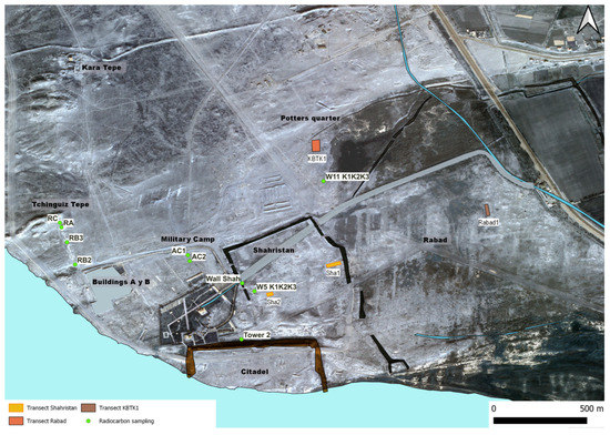 The Termez archaeological complex occupies an area of about 550 ha. It comprises four fortified enclosures (Citadel, Tchingiz Tepe, Shahristan or Low Town, and Rabad). There was also human occupation in the suburbs, especially in the north (Potters’ Quarter) and at the site’s eastern end, with a palace complex dated to about the 11th century, which has now disappeared (Figure 3). The oldest part of the settlement was in the Citadel (Phrourion), where archaeological levels are dated to the late 4th–early 3rd centuries BCE. These levels are associated with colonisation by Greek populations who were present in the region following the conquests of Alexander the Great [14,15]. Although the Citadel must have been founded as a fortified settlement, the original Greek wall has not been located. In contrast, the wall from the Kushan period, made with adobe, and the Islamic wall (of brick) are known; the latter was attached to the Kushan wall on its outer face [2] (pp. 83–97). Two large adobe buildings located 600 m north-west of the Citadel (Buildings A and B) have been interpreted as part of a cult complex. Excavations in this area have suggested an age in the Greco-Bactrian period, with some remodelling in the Kushan period [16] (pp. 190–200) and [17] (pp. 34–36).