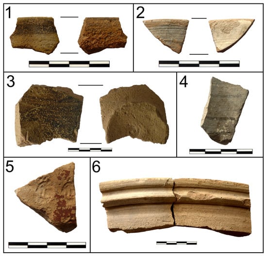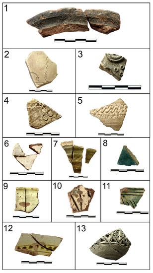 At the end of the 7th century, the region was conquered by the Arabs, resulting in a complete change in the formal and decorative repertory of the pottery [5,6,22,27]. Glazes are frequent from the 9th and 10th centuries, especially in the case of tableware. They were often glazed with a single colour (white, green, yellow, or turquoise) but complex compositions with figurative or geometric motifs in different contrasting colours are quite common. The sgrafiatto technique consisted of scraping the surface with an awl before firing the vessel; it was combined with figurative or geometric decoration by applying layers of colour over the surface. Unglazed pottery is also common in Islamic pottery assemblage, usually decorated with various techniques, such as impression, incision, plastic applications, stamps, and moulds (Figure 6). Pots covered with a black slip or coating are also recognisable and exclusive to the Islamic period. This slip normally covers the interior of the vessel and part of the outer surface in a pattern of drip lines from the rim to the base. Other characteristic productions of the Islamic period are spherical-conical vessels, often made in moulds and usually decorated with complex patterns (sometimes with Arabic letters). They have thick walls and a hole with a very small diameter which would have been used to control the pouring out of the product they contained. Despite being very common in the archaeological record of ancient Termez, their purpose is still unknown.