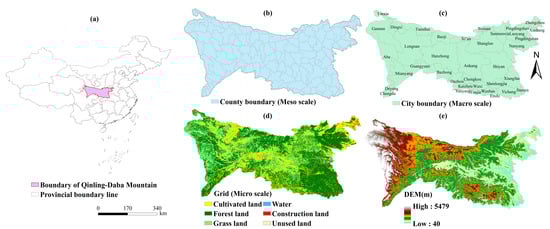 Geographical location (a), county-level administrative boundary (at a meso scale) (b), city-level administrative boundary (at a macro scale) (c), land cover (at a micro scale) (d) and the elevation data (e) of the Qinling-Daba Mountain area.