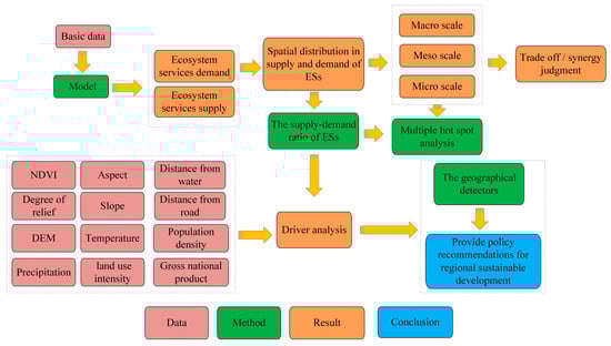 Aiming to study the characteristics of ecosystem management at different scales, this study evaluated the supply and demand of five ecosystem services in the Qinling–Daba Mountain region at the macro-, meso-, and microscales. On this basis, the study analyzed the synergistic relationship between the five ecosystem services and the trade-offs between supply and demand, as well as the spatial pattern of the surplus hotspots and deficit hotspots of the ecosystem services. Additionally, it analyzed the driving factors of the ecosystem services supply, demand, and trade-offs by using the geographical detectors model. This study can provide managers of all levels with a scientific basis for the development and utilization of natural ecosystems and help to ultimately achieve the goal of sustainable management. The research framework is shown in Figure 2.