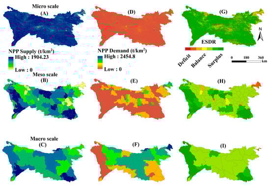 Spatial distribution of NPP supply (in t/km2), demand (in t/km2), and ESDR at the microscale (A,D,G), mesoscale (B,E,H), and macroscale (C,F,I) levels.