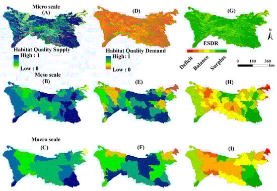 Spatial distribution of habitat quality supply, demand, and ESDR at the microscale (A,D,G), mesoscale (B,E,H), and macroscale (C,F,I) levels.