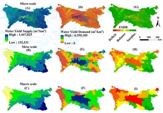 Spatial distribution of water yield supply (in m3/km2), demand (in m3/km2), and ESDR at the microscale (A,D,G), mesoscale (B,E,H), and macroscale (C,F,I) levels.