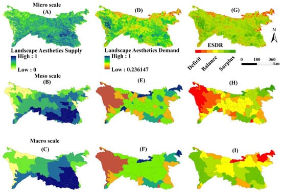 Spatial distribution of landscape aesthetic supply, demand, and ESDR at the microscale (A,D,G), mesoscale (B,E,H), and macroscale (C,F,I) levels.