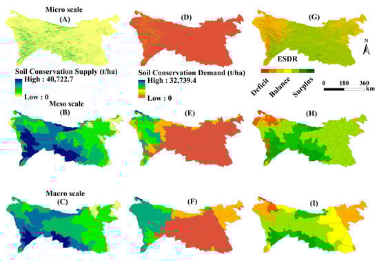 Spatial distribution of soil conservation supply (in t/ha), demand (in t/ha), and ESDR at the microscale (A,D,G), mesoscale (B,E,H), and macroscale (C,F,I) levels.