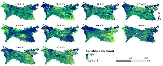 A correlation analysis revealed significant correlation variations between ecosystem services in the Qinling–Daba Mountain region. The spatial distribution exhibited a pattern of synergistic relationships around the perimeter and tradeoffs in the middle (Figure 8). Specifically, there were similar spatial distributions of synergistic relationships between NPP and HQ, LA, and SC. The high values were concentrated in the Fushun Mountain region and the western part of the Qinling Mountain range. This can be attributed to the strong regional dependence of NPP, dense vegetation, favorable growth conditions in mountainous areas, and the positive impact of increased vegetation cover on the quality of NPP. The tradeoff areas of water yield and HQ, LA, and SC were primarily concentrated in the central part of the region. This is mainly due to the dominance of cultivated vegetation, the arid climate, and poor vegetation growth conditions in this region. Moreover, the relationship between LA, SC, and HQ was more complex and varied across different regions. The synergistic relationship was mainly observed in mountainous areas with higher elevation, where human activities have less impact on the vegetation landscape. The natural factors such as precipitation, temperature, altitude, and soil vary across different zones in mountainous areas, reflecting their multidimensional zonation. These variations in factors influence the ecosystem service functions across time and space. The relationship between ecosystem services is transformed at different scales, leading to trade-offs and synergistic relationships that vary over time. This highlights the multidimensional zonation of the region. Consequently, the impacts on ecosystem services contribute to high heterogeneity.