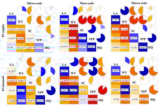 Correlation coefficients between ES indicator supply and demand pairs at different scales. (The blue color and a slash from bottom left to top right indicate a positive correlation between the two variables. On the contrary, the red and slash from top left to bottom right indicate a negative correlation. The darker the color, the higher the saturation, indicating a greater correlation between variables. The correlation size in the upper right corner is displayed by the size of the filled pie chart block, with clockwise filling indicating positive correlation and counterclockwise filling indicating negative correlation. No * means p < 0.05; ** means p < 0.01).