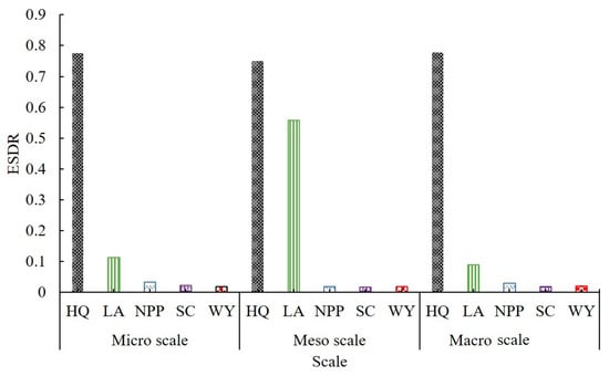 This study utilized the correlation analysis method (Figure 10) to assess the correlation coefficients between ecosystem service supplies at different scales. The results demonstrated that the tradeoffs and synergistic relationships between ecosystem service supply and demand varied depending on the scale. Notably, the supply–demand relationships for all five ecosystem services were significantly correlated across all three scales. Based on the distribution of the mean ESDR values of the five ecosystem services, it can be observed that the mean ESDR values of HQ, CS, NPP, and WY were inconsistent across the three scales. However, the mean ESDR value of LA was significantly higher than that of micro and macroscales at the mesoscale, suggesting that LA has a surplus at the mesoscale. The internal variation in the five ecosystem services at the three scales showed relatively small fluctuations, indicating a relatively smooth supply and demand status in the region. Therefore, there is unlikely to be a large-scale problem of differences between supply and demand.
