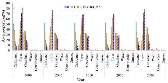 According to the percentage analysis of the total land area in the Qinling–Daba Mountains, the hot spot areas with supply and demand ratios of the five ecosystem services below the average from 2000 to 2020 accounted for 13.14% of the total area. The proportion of hotspots with supply and demand ratios of one, two, and three ecosystem services higher than the annual average was 16.23%, 20.11%, and 23.87%, respectively. The proportion of hotspots with supply and demand ratios of the five ecosystem services that were higher than the annual average was only 7.38%. Overall, all the service supply and demand hotspot areas only accounted for 7.38% of the total area. Croplands, grasslands, and forestlands were the main land use types in these multiple ecosystem service supply and demand hotspot areas (Figure 11). The supply–demand ratios of multiple services in the southwestern and southeastern parts of the Qinling–Daba Mountains from 2000 to 2020 were generally high, indicating they can meet the demand for five ecosystem services. However, the central and northeastern parts of the region struggled to meet the demand for ecosystem services and cannot provide high-quality ecosystem service supply effectively. This is mainly due to the significant amount of arable land, rapid economic and urbanization growth, and population concentration in these areas. By using the multiple ecosystem service supply and demand hotspot map, we can clearly identify the impact of ecosystem service supply and demand in the Qinling–Daba Mountain area and determine which areas have a high demand for ecosystem services.