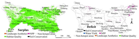 The dominant ESDR hotspots primarily indicate the overall situation of regional ecosystem service supply and demand. In this study, the hotspot map was divided into two categories: ecosystem service surplus hotspots and deficit hotspots (Figure 12). The spatial distribution patterns of these two categories showed clear consistencies. Among them, the ecosystem service surplus hotspot revealed that 90% of the region was covered by habitat quality services, indicating that the regional supply of ecosystem services exceeded the demand by a significant margin, resulting in a large surplus. Consequently, the entire region was predominantly characterized by habitat quality services (Figure 13). The deficit analysis of ecosystem services revealed that 1.9% of the region experienced significant deprivation of NPP. This deprivation was concentrated in areas such as Yichuan County, Dengfeng City, Xinmi City, and Gangu County. Additionally, the deprivation of soil conservation services was sporadically distributed in the Wudu District and Minxian County of Gansu Province. The main cause of this deprivation was the limited supply of regional carbon sequestration services. Furthermore, there was a surge in demand for carbon sequestration services from human activities and economic development, exacerbating the supply–demand gap for carbon sequestration in the region.
