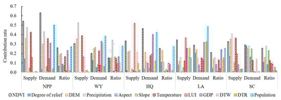 The results obtained from the factor detector reveal the individual contributions of each driver to the spatial distribution of ecosystem services (Figure 14). There are variations in the extent of influence that different drivers have on ecosystem services. In terms of carbon-sequestration services, the NDVI factor (0.544) and precipitation (0.477) were found to have the highest contribution rates. For water yield services, the contribution rates in descending order were precipitation (0.527), air temperature (0.387), DEM (0.352), and the NDVI (0.305). This indicates that precipitation and air temperature are the dominant factors influencing the spatial distribution of water yield services. The spatial distribution of water yield services in different regions is influenced by various factors. These include precipitation, temperature, land use intensity (0.522), and the NDVI (0.335). Among these factors, land use intensity and the NDVI have a significant impact on water yield services. Additionally, the contribution rate of landscape aesthetic services is influenced by land use intensity (0.366), the NDVI (0.345), population density, and GDP. Precipitation (0.411), temperature (0.363), and the NDVI (0.326) play a more prominent role in regional soil conservation services. Natural factors, particularly surface vegetation, have a positive effect on regional soil conservation. In the demand for ecosystem services, population density and GDP had a more significant effect on NPP, water yield, habitat quality, and landscape aesthetics services, respectively. Additionally, DTR and DTW contributed 0.3228 and 0.3268 to landscape aesthetics services, respectively. The factors that had a greater effect on the ratio of ecosystem supply to demand were precipitation, the NDVI, and population density. For example, NPP, HQ, and LA contributed to population density, with contributions of 0.27, 0.2726, and 0.2541, respectively. Moreover, soil conservation and water yield services were influenced more by the NDVI (0.256) and precipitation (0.3426), respectively.