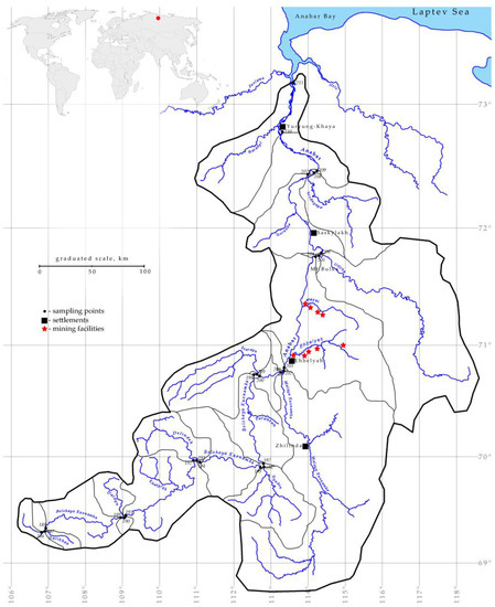 The study was carried out on a section of the Anabar River with a length of 897 km: from the mouth of the Darikhan River to the Anabar Bay (Figure 1). Anabar is a large river of the Arctic basin in the northeast of Siberia. The length of the river is 939 km; the catchment area is 100 thousand km2. The Anabar basin is entirely located beyond the Arctic Circle. The source of the river is located among the tundra swamps of the Anabar plateau. The river crosses several soil and vegetation zones: northern taiga, forest tundra, and tundra. Anabar has no delta and, flowing into the Laptev Sea, forms a typical estuary—Anabar Bay [11].