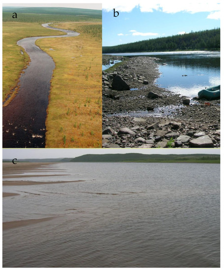 View of sampling stations of the Anabar River in 2008. Bolshaya Kuonamka River near the Darikhan River mouth (a), Bolshaya Kuonamka River below the Dyuken River mouth (b), Anabar River below the Udzha River input (c), water with low transparency. Photo (a) by A. Klimovsky; (b) and (c) by V. Gabyshev.