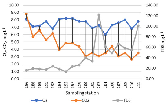 The dynamics of indicators of water saturation with oxygen and carbon dioxide are shown in Figure 3, where both indicators gradually decrease from the upper reaches to the mouth of the river. Water saturation with dissolved salts (TDS) has a sharp maximum at station 203, then decreases and rises only towards the river mouth.