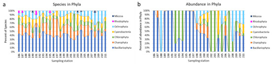 The dynamic of species richness (a) and phytoplankton abundance (b) in phyla over sampling stations in the Anabar River in 2008, Eastern Siberia, Russia (no. of sampling stations as in Table 1).