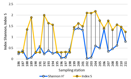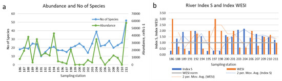 Species richness generally increases downriver and has similar dynamics to phytoplankton abundance (Figure 5a). The dynamics of the saprobity index at the stations of the river has, on the contrary, a controversial synchrony with the WESI index, which reflects the suppression of photosynthetic activity (Figure 5b), especially on the stations 188–189, 194, 203, 204 and 207.