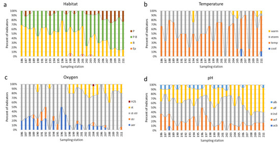 Bioindication histograms for dynamic of species-indicators of the habitat preference (a), water temperature (b), oxygen (c), and water pH (d) oversampling stations in the Anabar River in 2008, Eastern Siberia, Russia (no. of sampling stations as in Table 1). Abbreviations of the ecological groups: Habitat (Ep—epiphyte, P—planktonic, P-B—plankto-benthic, B—benthic). Temperature preferences (cool—cool-water, temp—temperate, eterm—eurythermic, warm—warm-water). Oxygen and streaming (st—standing water, str—streaming water, st-str—low streaming water, aer—aerophiles, H2S, anoxia with sulfides). pH preferences groups (pH) according to Hustedt (1957) [28] (alb—alkalibiontes; alf—alkaliphiles, ind—indifferent; acf—acidophiles; acb—acidobiontes).